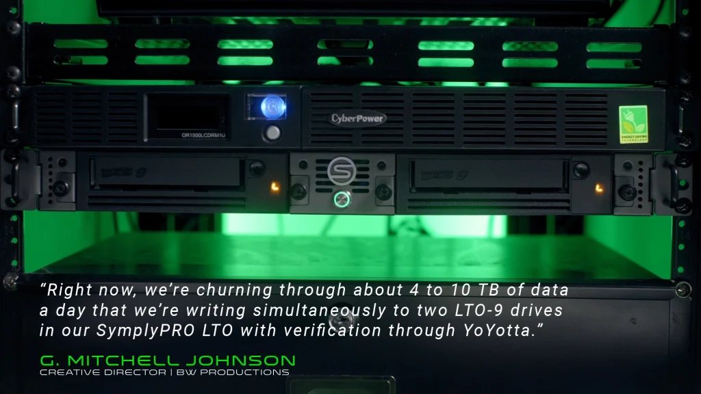 BW Productions shoot around 350 projects a year, and that translates to around six to eight terabytes of data per week. When they originally purchased the 1RU SymplyPRO unit, they chose a single LTO-9 half-height drive because that met all their current data demands. Shortly after though, BW Productions landed a large project where they had to backup dailies for a major streaming platform. “Once we landed that contract,” begins Brent, “it was so easy for us to upgrade and add another drive to our unit to give us dual writing capabilities.” Right now, BW Productions are churning through about four to ten terabytes a day with dual copies being made simultaneously through their two LTO-9 drives in their SymplyPRO 1RU system, with verification being handled through YoYotta software for macOS.