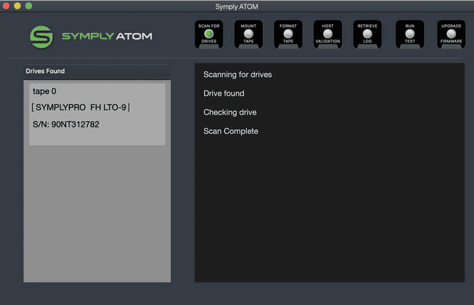 SymplyATOM is a free macOS tool, designed to work with the SymplyPRO Tape family of products. It is intended to provide casual and expert-level users equal access to the essential features for diagnostic control, log gathering and updating firmware of the SymplyPRO products. ATOM also supports the latest version of LTFS for the macOS to provide basic tools for formatting, mounting and unmounting LTFS tapes. ATOM can support up to two (2) LTO drives from generation 6 upwards and is free to download from our support portal.