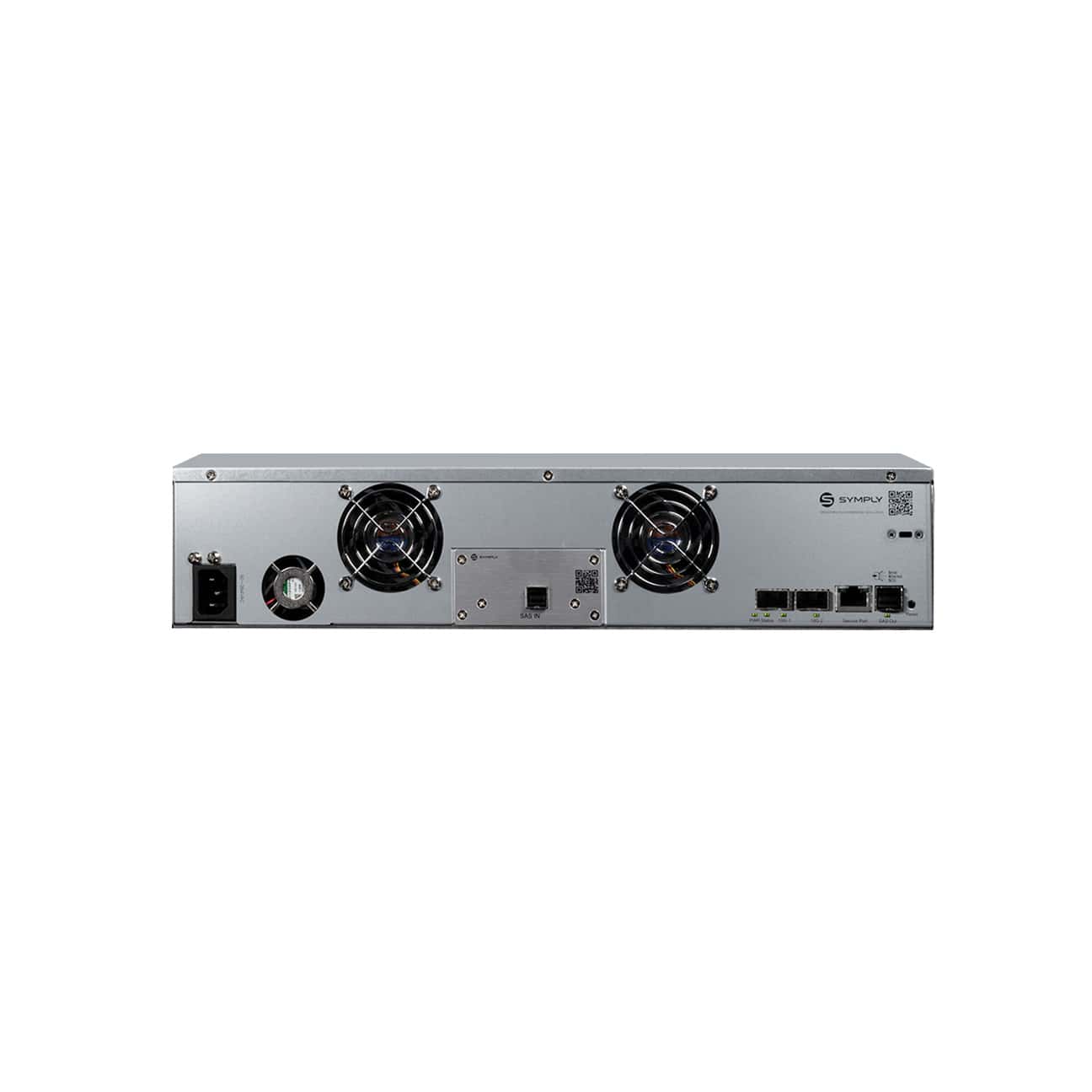 SymplyPRO 2RU Ethernet is a single or dual full-height drive LTO appliance that enables sharing of up to four LTO drives over a 10Gb iSCSI Ethernet network—no dedicated servers required. Built into a rugged 2RU metal alloy chassis, it features Symply CableLess technology for easy upgrades, along with dual 10Gb Ethernet SFP ports, SAS Expansion and Host Ports, premium cooling, and a robust power supply.